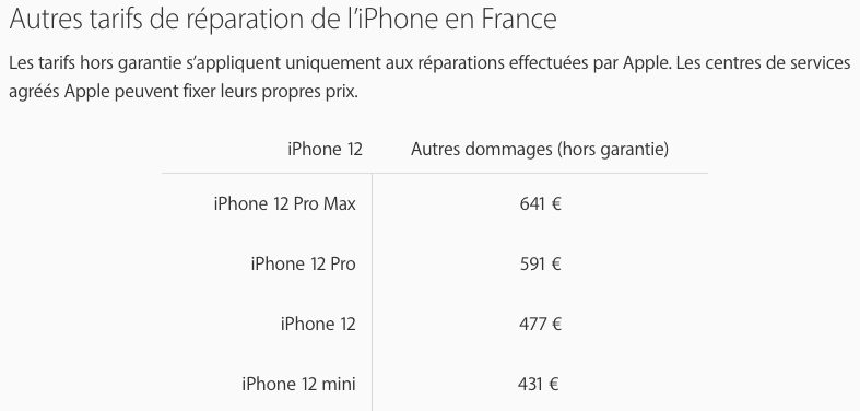 Ainsi, si votre iPhone 12 mini est endommagé, Apple demande 431 euros pour le réparer. Pour l’iPhone 12 Pro Max, le constructeur demande 641 euros. Cependant, si vous avez le contrat AppleCare+, vous allez payer uniquement 99 euros.