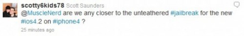 Un utilisateur bien impatient a demandé à MuscleNerd si celui-ci aller livrer une solution de jailbreak untethered pour l’iOS 4.2.1. La réponse, cf MuscleNerd, est oui !