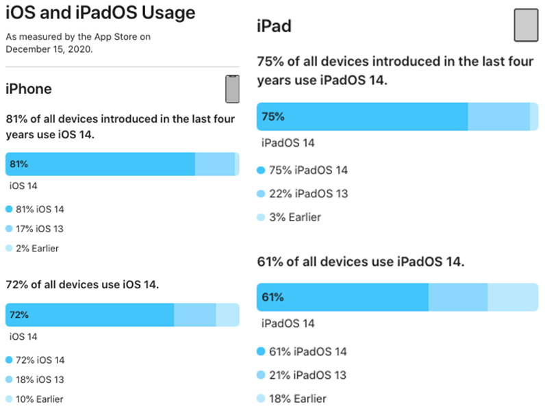 Pour l’iPad, iPadOS 14 est installé sur 61% des iPad, 21% des tablettes sont sur iOS 13 et 18% utilisent une version moins récente. En ce qui concerne les iPad qui ont vu le jour au cours de ces quatre dernières années, la part d’installation d’iPadOS 14 est de 75%, 22% pour iPadOS 13 et 3% pour les versions antérieures.