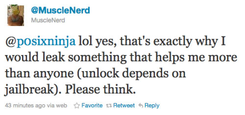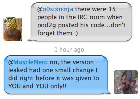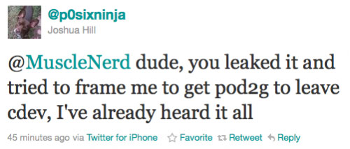 Il dit en gros que MuscleNerd a tenté de l’amener à la conclusion que c’est pod2g qui a livré le code source de Shatter, mais qu’il sait que c’est faux !  ( oui c’est un peu compliqué :p )