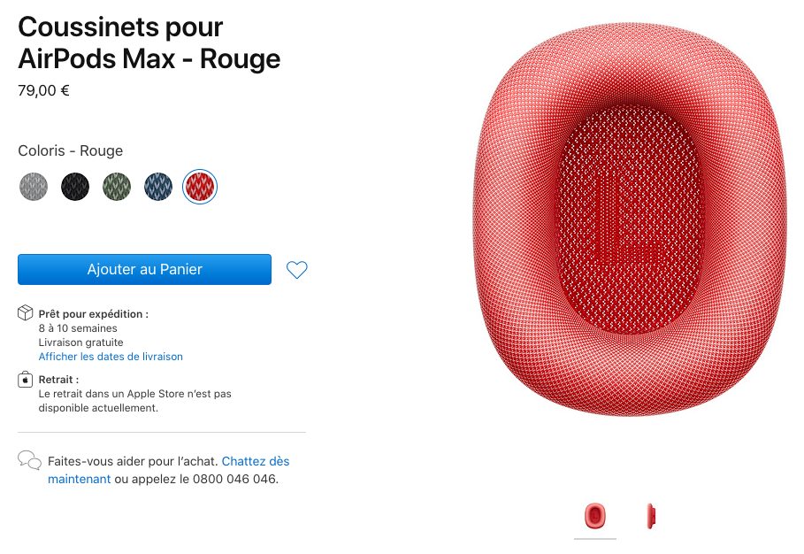 L’accessoire est proposé en cinq coloris : argent, noir, vert, bleu ciel et rouge. Ainsi, un utilisateur peut acheter des coussinets de couleur différente de celle du casque afin de personnaliser ses AirPods Max en déboursant les 75 euros pour avoir une paire. Rappelons que le changement des coussinets peut se faire facilement, puisqu’ils sont attachés magnétiquement aux AirPods Max.