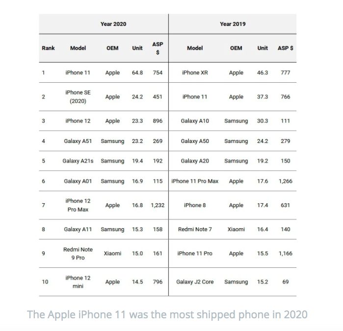 Les donnés d’Omdia nous montrent que l’iPhone 11 a réalisé 64,8 millions de ventes. La deuxième place est occupée par l’iPhone SE (2020) avec 24,2 millions d’unités vendues. Nous retrouvons en troisième position l’iPhone 12 avec 23,3 millions d’exemplaires. Ensuite vient le Galaxy A51 avec 23,2 millions d’exemplaires vendus, le Galaxy A21s avec 19,4 millions d’unités vendues et le Galaxy A01 de Samsung avec 16,9 millions de ventes. Le reste du top 10 comprend : l’iPhone 12 Pro Max avec 16,8 millions de ventes en septième position, le Galaxy A11, le Redmi Note 9 de Xiaomi et enfin l’iPhone 12 mini avec 14,5 millions d’exemplaires vendus.