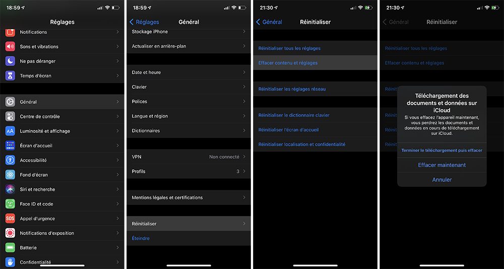 Lorsque vous avez votre iPhone entre les mains, vous devez d’abord déconnecter les identifiants Apple puis effacer le contenu et les réglages.