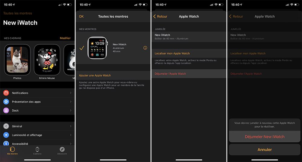 Vous devrez impérativement déjumeler l’Apple Watch de votre iPhone. Si vous ne le faites pas, le verrouillage d’activation s’active et seuls vous, et le mot de passe de votre compte Apple, pourront le déverrouiller. Déjumeler l’Apple l’enlève de la liste de vos appareils. Cela se fait uniquement depuis l’iPhone.