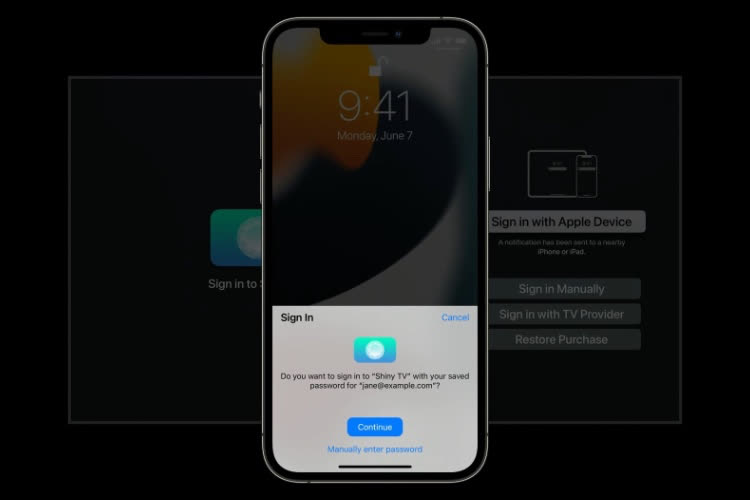 Avec la version de tvOS 15 sur l’Apple TV, la connexion aux applications se fera plus rapidement et facilement grâce à Face ID ou Touch ID depuis un iPhone.