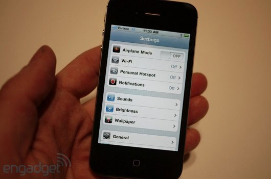 Comme vous le voyez sur le screenshot ci dessus, tiré tout droit du site Engadget, l’iPhone (qui tourne donc sur le réseau Verizon) est équipé de l’iOS 4.2.5, qui n’est présentement pas disponible.