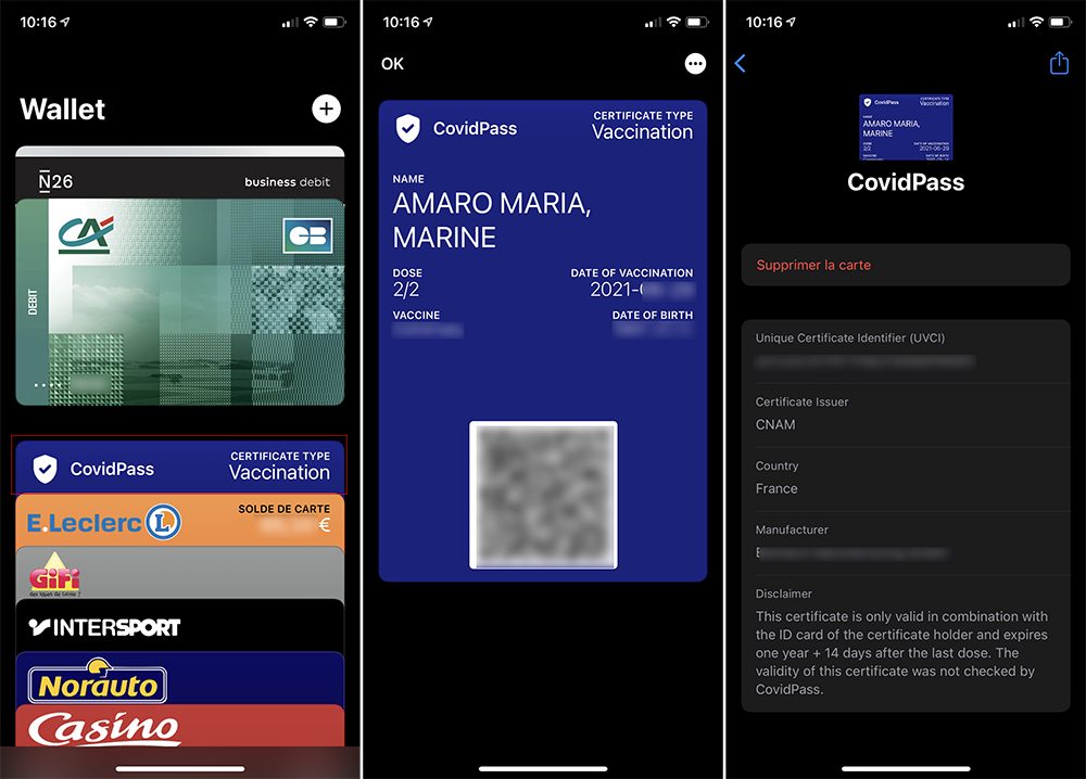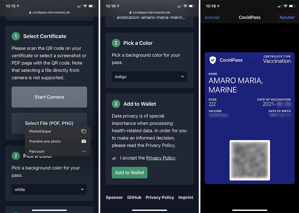 Vous allez devoir télécharger la preuve vaccinale ou le résultat d’un test PCR (ou antagonique) contenant le QR Code, si on ne vous l’a pas imprimé. Ainsi il vous faudra 2 appareils : un pour télécharger le certificat et un autre, votre iPhone, pour scanner le QR Code. Cependant, rien ne vous empêche de l’imprimer pour mieux le scanner ou en conserver une copie papier (et/ou PDF) dans votre portefeuille. Le QR Code qui doit être présenté peut être stocké sur vos appareils d’une manière ou d’une autre ou au format papier.