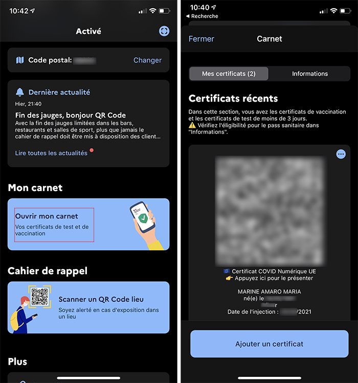 Dans ce carnet vous retrouverez vos différents QR Code et vous permet également d’en ajouter un nouveau avec Ajouter un certificat.