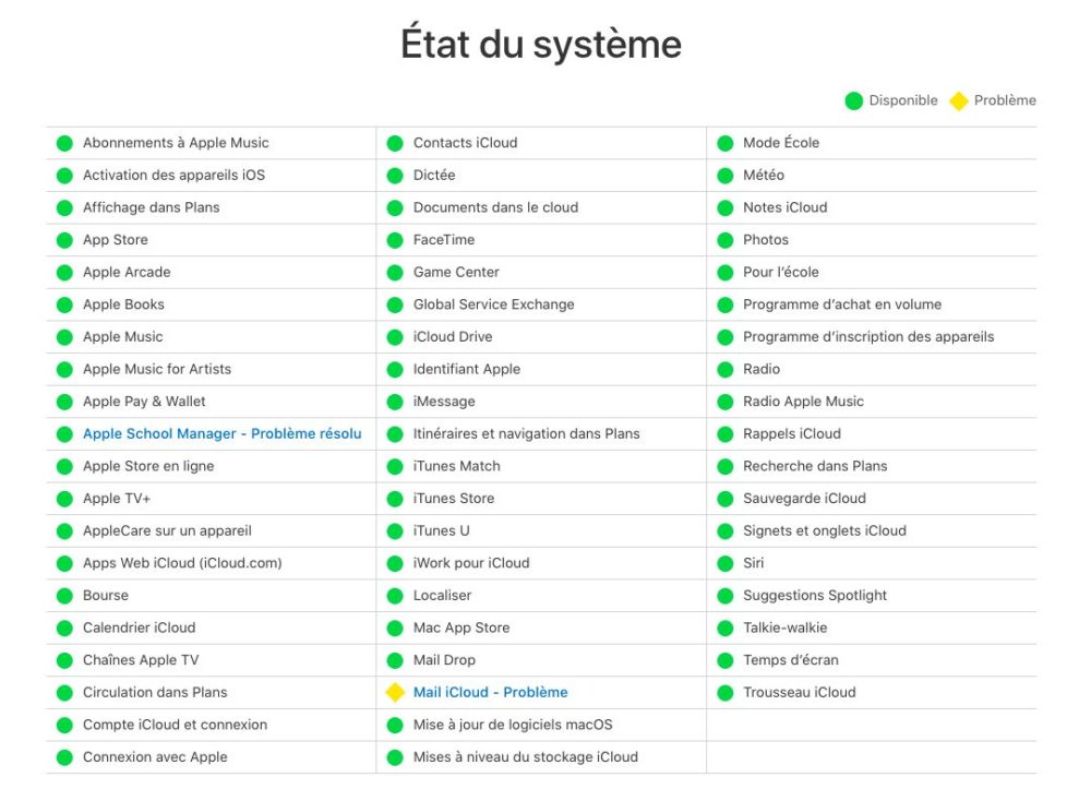Le fabricant indique que « Certains utilisateurs sont affectés. Les utilisateurs ne peuvent peut-être pas envoyer et recevoir d’e-mails ni les consulter ». Apple n’annonce pas quand la panne sera résolue. De ce fait, si vous êtes touché, vous devez espérer le temps que tout redevienne normal.