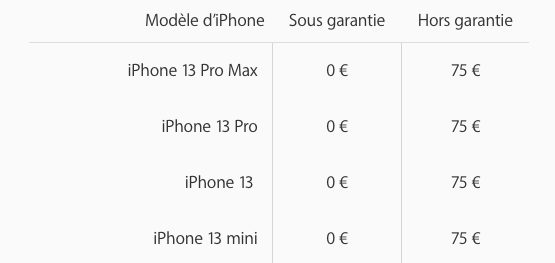 Pour changer la batterie de l’un des quatre iPhone 13, si vous l’AppleCare+, c’est gratuit. Mais si l’iPhone n’est pas sous garantie, le prix à payer sera de 75 euros.