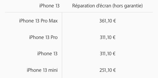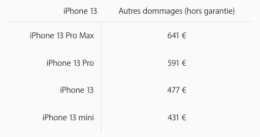 Pour tout autre dommage sans AppleCare+, Apple demande 431 euros pour l’iPhone 13 mini. C’est 477 euros pour l’iPhone 13. Si votre iPhone 13 Pro subit un autre dommage, ce sera 591 euros et 641 euros pour l’iPhone 13 Pro Max. Ceux qui ont l’AppleCare+ payeront 99 euros.