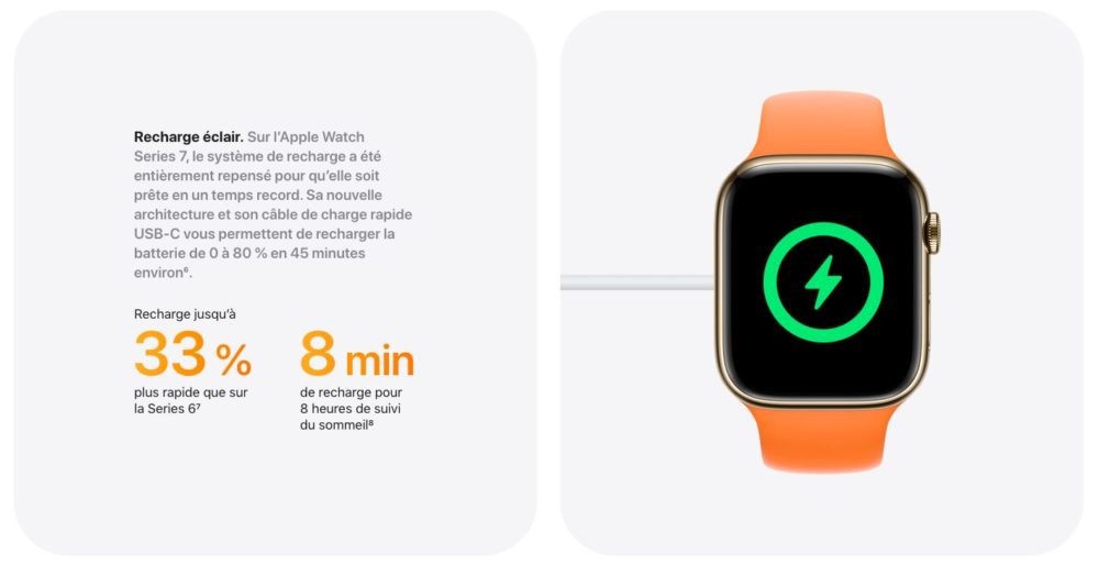 Apple indique sur son site que sur l’Apple Watch Series 7, le système de recharge a été entièrement repensé pour qu’elle soit prête en un temps record. Ainsi, sa nouvelle architecture et son câble de charge rapide USB‑C permettent à l’utilisateur de recharger la batterie de 0 à 80 % en 45 minutes environ.