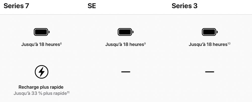 La différence principale c’est que pendant que les Series 7 et SE se charge en USB-C, la Series 3 est en USB-A.