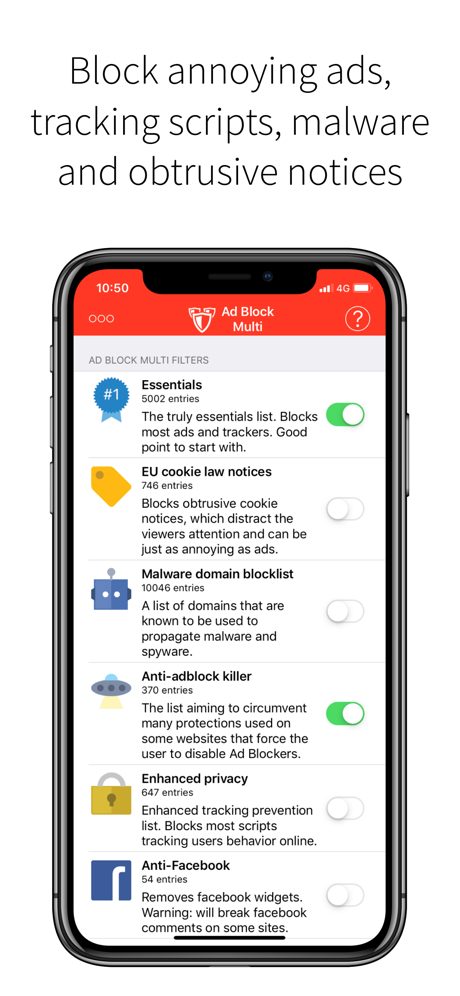 Pourquoi se limiter à quelques filtres prédéfinis comme le font les autres bloqueurs de publicités ? 21 listes de filtres et comptage, dont des régionales précises ! Trouvez une combinaison qui vous convient. Fatigué de voir des publicités en surfant sur le net avec Safari ? Les mentions légales sur les cookies vous semblent évidentes ? Vous pensez sérieusement à la confidentialité en ligne ? Alors Ad Block Multi est là pour vous aider !