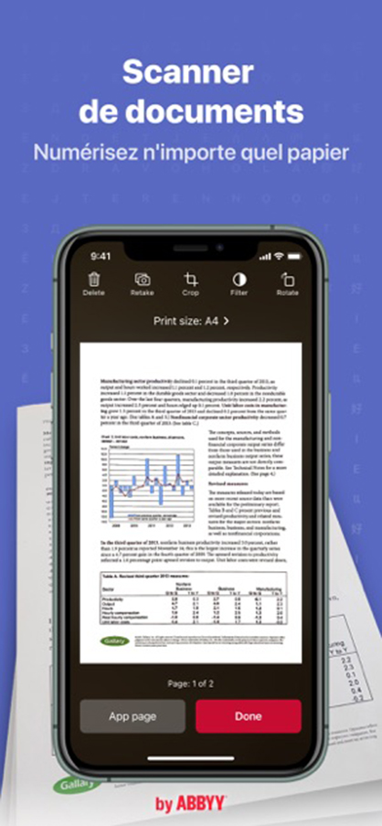 Votre meilleur scanner de document ! Numérise et convertit les documents en PDF, Word, Excel, PPT, TXT, FB2, EPUB et les partage partout. ABBYY FineReader PDF Pro – le premier scanner intelligent fonctionnant grâce à l’IA qui transforme votre appareil mobile en un outil multifonctions permettant de capturer rapidement des documents et des livres, de créer des copies électroniques aux formats PDF et JPEG et d’extraire des textes à partir des documents scannés, rendant possible leur édition et leur partage.