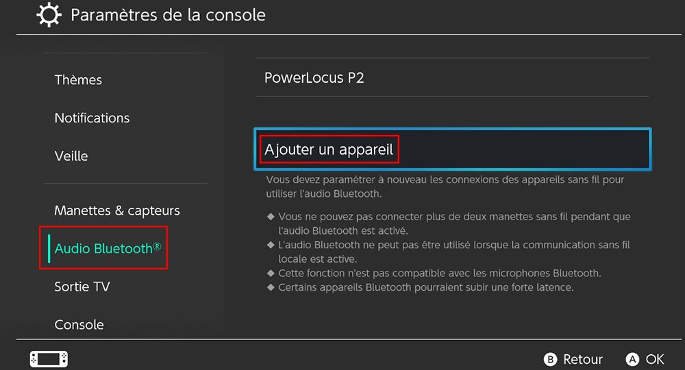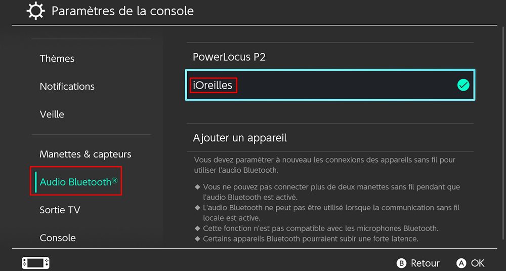 Par défaut, lorsque vous mettez vos AirPods à vos oreilles, ils se reconnectent au dernier appareil où ils étaient connectés. Si ce n’est pas la Switch, allez dans Paramètres de la console > Audio Bluetooth et sélectionnez-les.