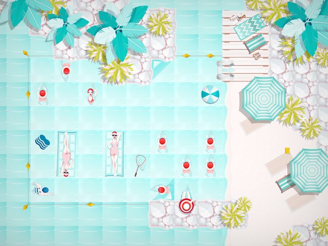 Découvrez Swim Out, un jeu de puzzle/stratégie tour par tour à l’atmosphère relaxante et dépaysante. Nagez dans le bleu étincelant de piscines limpides, le courant rafraîchissant de rivières, ou au gré du roulis de l’océan, mais à une condition : ne croisez jamais le chemin des autres nageurs si vous voulez rejoindre le rivage et vous prélasser dans votre chaise longue !