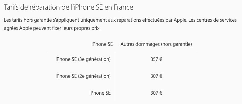 Sans l’AppleCare+, Apple indique que le prix pour faire réparer un iPhone SE de 3e génération est de 357 euros. Ce prix concerne les dommages autres que l’écran et la batterie. Par contre, si vous avez l’assurance AppleCare+, la somme à payer sera de 29 euros pour un dommage au niveau de l’écran ou du panneau arrière en verre et de 99 euros pour un tout autre type de dommage.