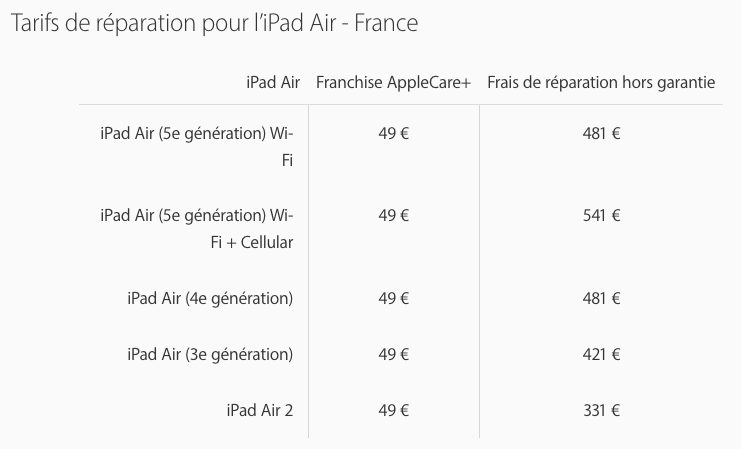 Pour la batterie, le prix est de 109 euros sans garantie et l’utilisateur ne payera rien si la tablette est sous l’assurance AppleCare+. Concernant l’écran, Apple ne donne pas un prix pour la réparation. Mais il est possible de faire une demande afin d’avoir un devis.