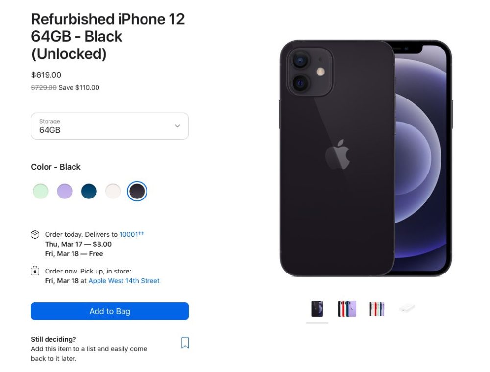 Ainsi, reconditionné, un iPhone 12 avec 64 Go de stockage est vendu au prix de 619 dollars. Neuf, ce même modèle coûte 729 dollars ; ce qui permet donc à l’utilisateur de faire une économie de 110 dollars. Le modèle plus cher est l’iPhone 12 Pro avec 512 Go de stockage : reconditionné, son prix est de 1 019 dollars ; neuf, il faut débourser 1 199 dollars, une remise de 180 dollars, donc.