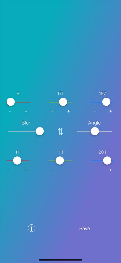 Gradient Background Maker peut être utilisé pour créer de belles images en couleur qui peuvent être enregistrées comme arrière-plan de votre appareil, utilisées comme arrière-plan de site Web ou utilisées dans vos propres applications. Sélectionnez simplement la quantité de rouge, de vert et de bleu pour les moitiés supérieure et inférieure, choisissez l’angle de mélange des couleurs, puis la quantité de flou. Une fois que vous êtes satisfait des couleurs, appuyez sur le bouton « Enregistrer » et enregistrez votre image ! Absolument n’importe quelle couleur peut être créée et une fois vos images heureuses peuvent être enregistrées directement dans l’application photos.