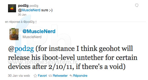 Un bref échange sur Twitter, entre MuscleNerd et pod2g nous laisse penser que GeoHot fera son retour sur la scène Jailbreak après le 10/02/2011.