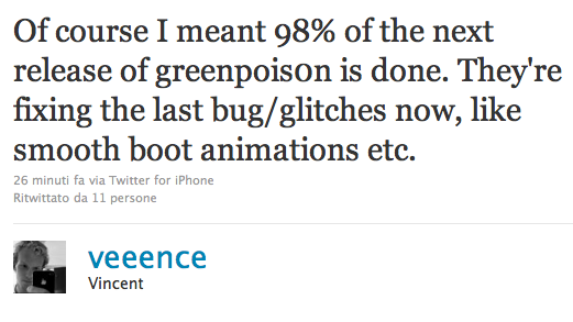 Bien sûr, je voulais dire que 98% de la prochaine version de greenpois0n était faite. Ils sont en train de fixer les derniers bugs / problèmes maintenant, comme le lag des animations de démarrage , etc