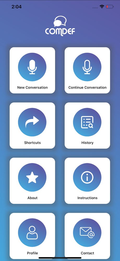 Comdef est une application pour téléphone intelligent qui permet aux aînés sourds et malentendants de participer à une conversation de groupe en temps réel sans interprète ASL (American Sign Language) et d’être immergés dans la dynamique de groupe de la discussion. L’application a été développée pour les réunions ou les réunions en petits groupes telles que les dîners de famille, les fêtes ou les petites réunions d’affaires. Comdef convertit les discussions de groupe en texte sur le téléphone sourd ou malentendant (utilisateur). L’utilisateur peut alors taper son entrée dans la conversation et le téléphone fera part de ses commentaires du texte écrit au groupe. Comdef permet à l’utilisateur d’être immergé dans la conversation du groupe et de participer en temps réel, éliminant ainsi le besoin d’un membre de la famille ou d’un interprète ASL embauché pour traduire la conversation du groupe à l’utilisateur et traduire les utilisateurs qui se reconnectent au groupe. Comdef est autonome et n’a pas besoin de connexion internet ou Wi-Fi.