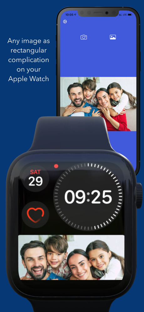 Affichez n’importe quelle image sous forme de grande complication graphique rectangulaire sur le cadran de votre montre ! (uniquement sur Apple Watch Series SE, 4, 5, 6, 7). Ayez une photo de votre famille, de votre animal de compagnie, de votre lieu préféré, de symboles inspirants, de rappels visuels, de votre club de sport préféré, d’un artiste ou simplement de motifs artistiques et amusants sur le cadran de votre Apple Watch ! Ajoutez n’importe quel type de texte aux images pour rendre le cadran de votre montre encore plus personnel !