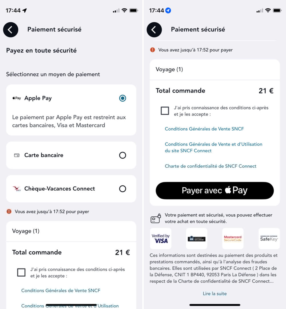 De ce fait, après avoir choisi votre billet de train et que vous soyez redirigé sur la page de paiement, vous aurez à présent la possibilité de choisir Apple Pay comme mode de paiement. Une fois choisi, vous verrez ensuite apparaître un bouton « Payer avec Pay », vous devez simplement taper dessus afin de confirmer et payer votre billet de train.