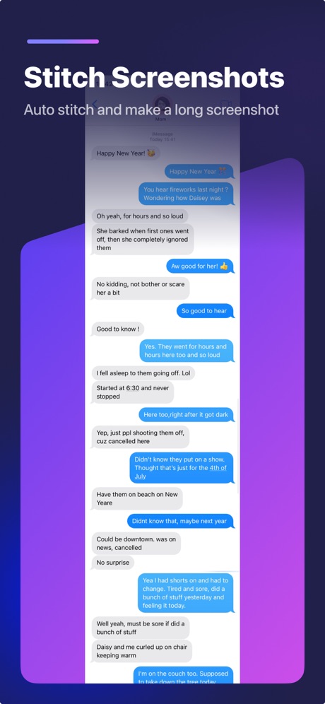 Assemblez automatiquement plusieurs captures d’écran en une seule longue image. Stitch Photos vous permet de créer une capture d’écran complète de la conversation, une capture d’écran de l’application de défilement ou une capture d’écran complète de la page Web. Prenez simplement quelques photos qui se chevauchent et nous les organiserons et les fusionnerons automatiquement en une longue capture d’écran pour vous.