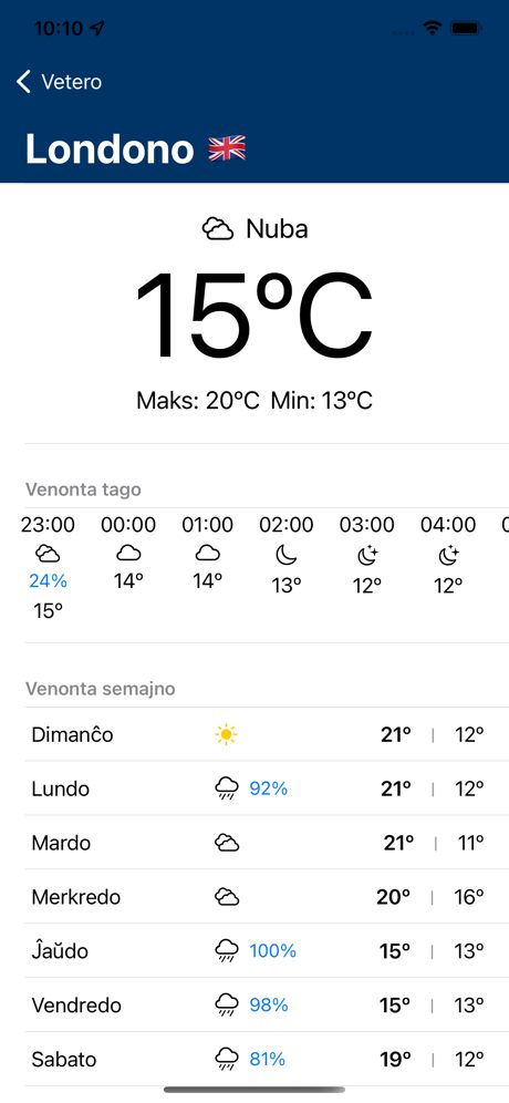 Vetero affiche les informations météo pour votre position actuelle et les villes du monde préférées entièrement en espéranto, avec une interface claire et facile à utiliser.