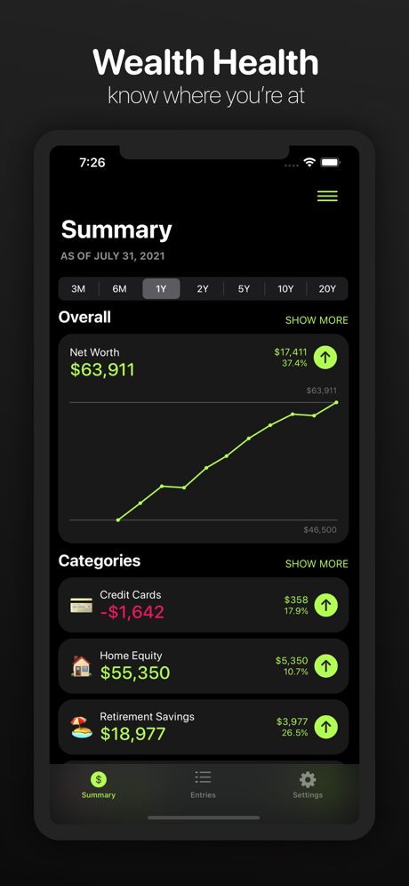 Avez-vous déjà eu l’impression qu’il était impossible d’aller de l’avant en ce qui concerne vos finances ? Le suivi de votre valeur nette est un excellent moyen de comprendre votre santé financière. La valeur nette est simplement tout ce que vous possédez et devez ensemble en un seul chiffre. Wealth Health est conçu pour vous montrer les tendances qui sous-tendent votre valeur nette et pour vous aider dans votre cheminement vers une bonne santé financière.