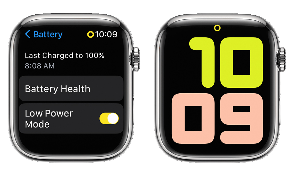 D’autre part, lorsque votre Apple Watch est en mode faible consommation, une icône de cercle jaune apparaît en haut de l’écran. De plus, le bouton de pourcentage de batterie dans le Centre de contrôle, l’animation de charge et l’heure en Mode Table de nuit deviennent tous jaunes.