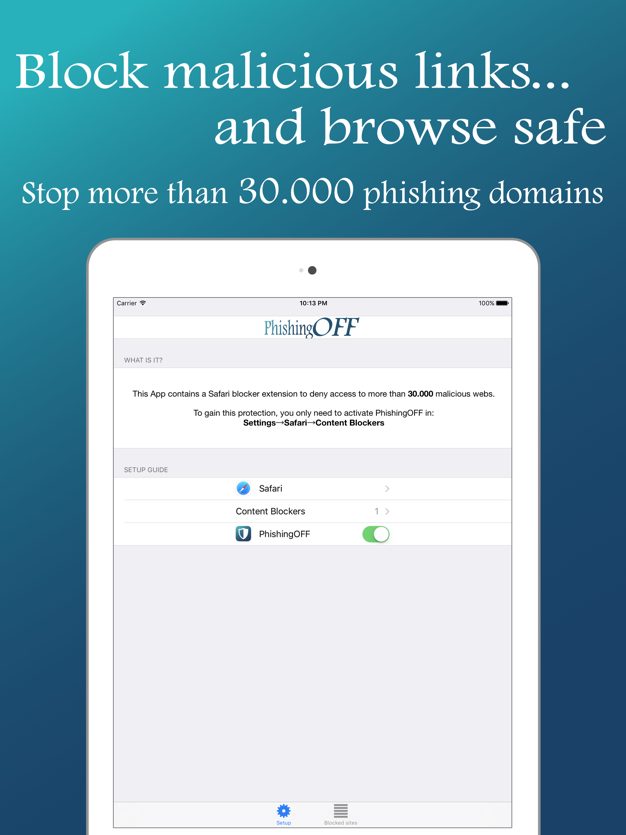 Restez en sécurité en bloquant les sites Web de phishing. Cette application vous aide à bloquer le contenu de phishing malveillant lorsque vous naviguez dans Safari. Il s’agit d’un bloqueur de contenu Safari qui bloque de nombreux sites de phishing et domaines malveillants pour empêcher le vol de données utilisateur. Son extension de blocage de contenu est optimisée pour maximiser les performances de Safari, bloquant plus de 30 000 sites malveillants.