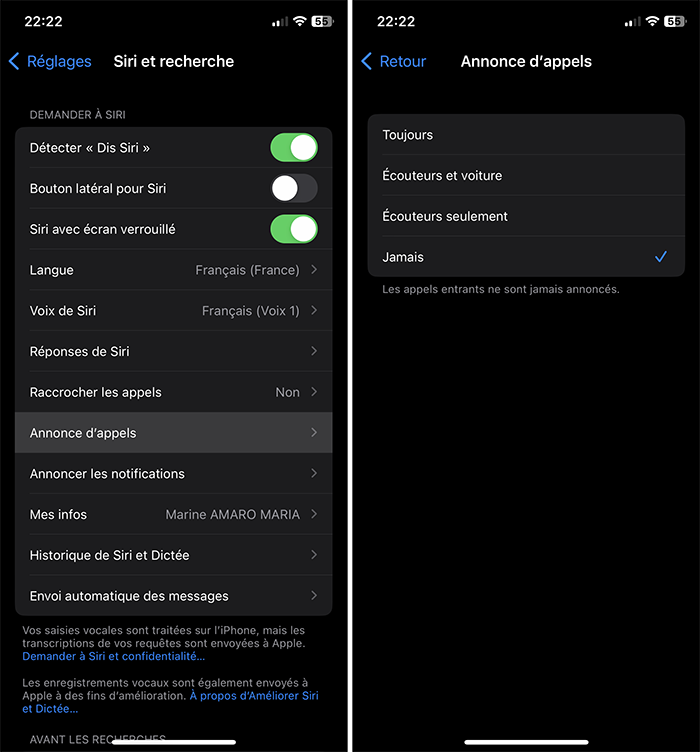 Bon à savoir : vous pourrez aussi retrouver ce réglage dans Réglages > Face ID (ou Touch ID) et code > Siri).