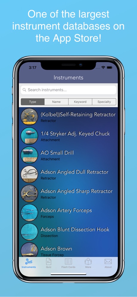 L’application Surgical Instrumentation est une excellente ressource pour en savoir plus sur les instruments utilisés en salle d’opération. Il peut être un outil de référence puissant pour les professionnels tels que les médecins, les infirmières en circulation, les technologues en chirurgie, les techniciens des services centraux et les étudiants.
