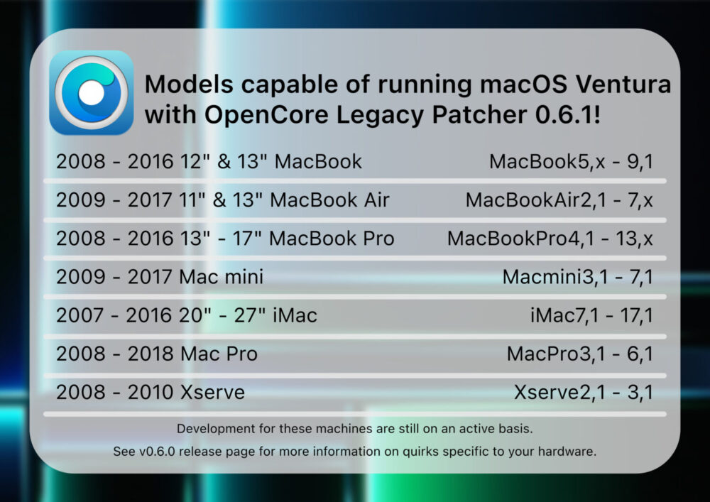 Ainsi, la nouvelle version d’OpenCore Legacy Patcher permet l’installation de macOS Ventura sur les Mac suivants :
