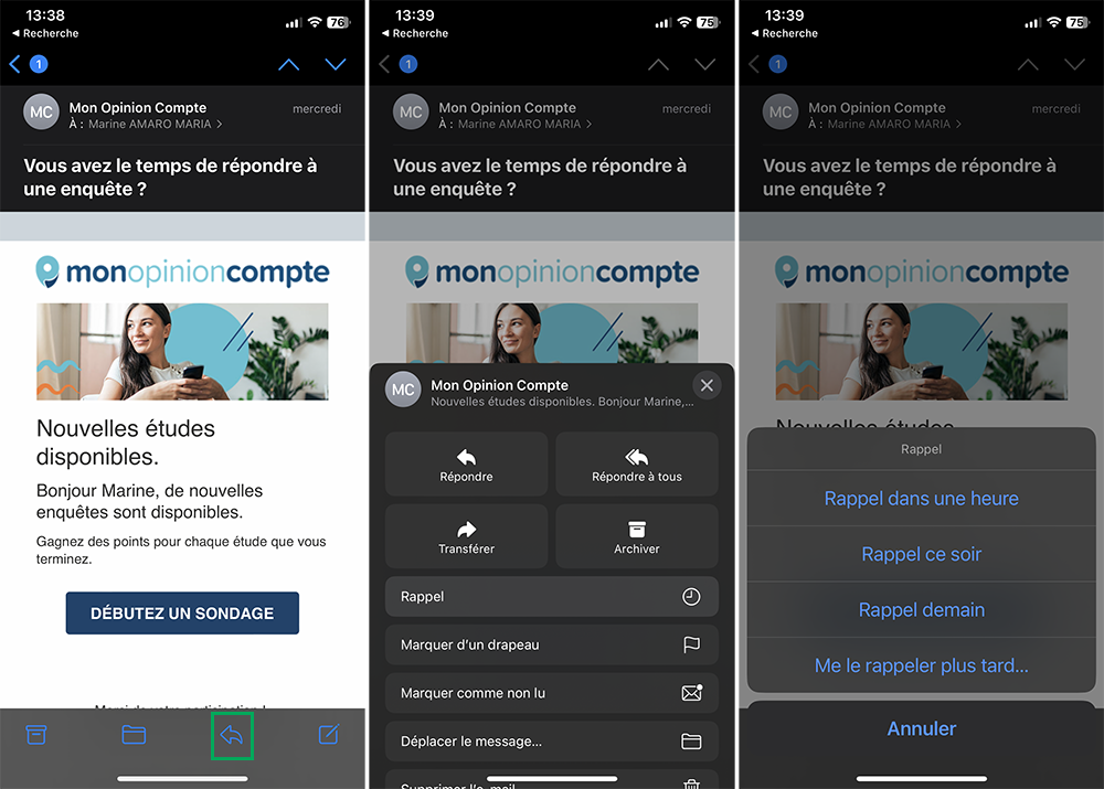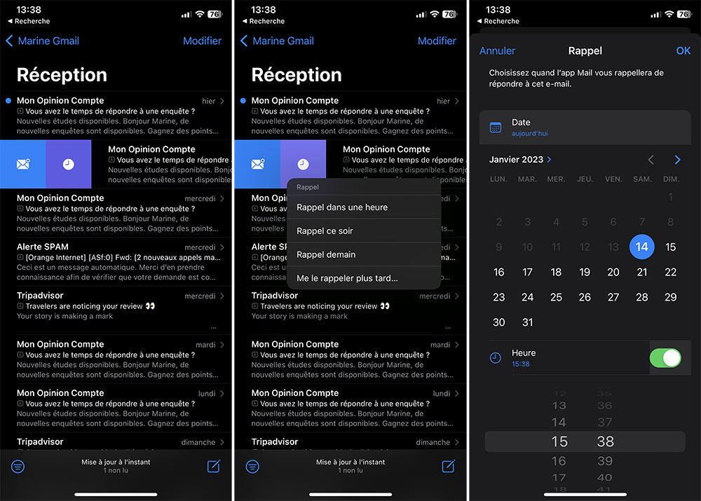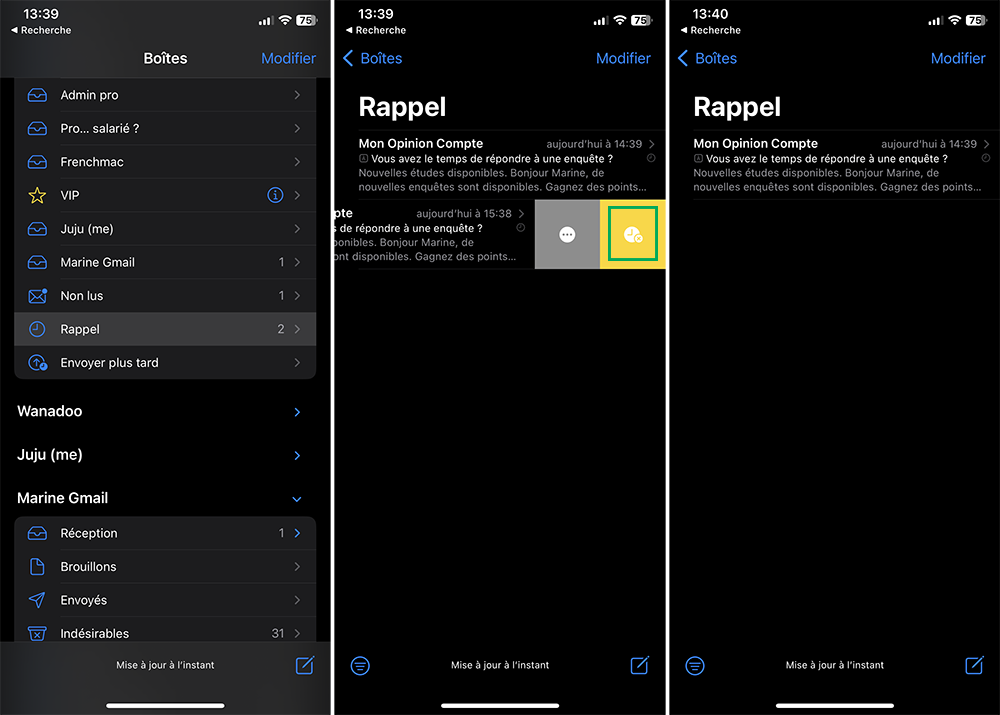 Bon à savoir : si vous glissez trop l’e-mail vers la droite, vous allez le marquer comme non lu.