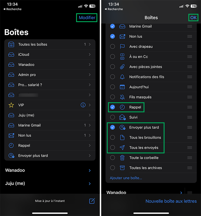 1.3. Cochez Rappel, Envoyer plus tard, Tous les brouillons et Tous les envoyés ;