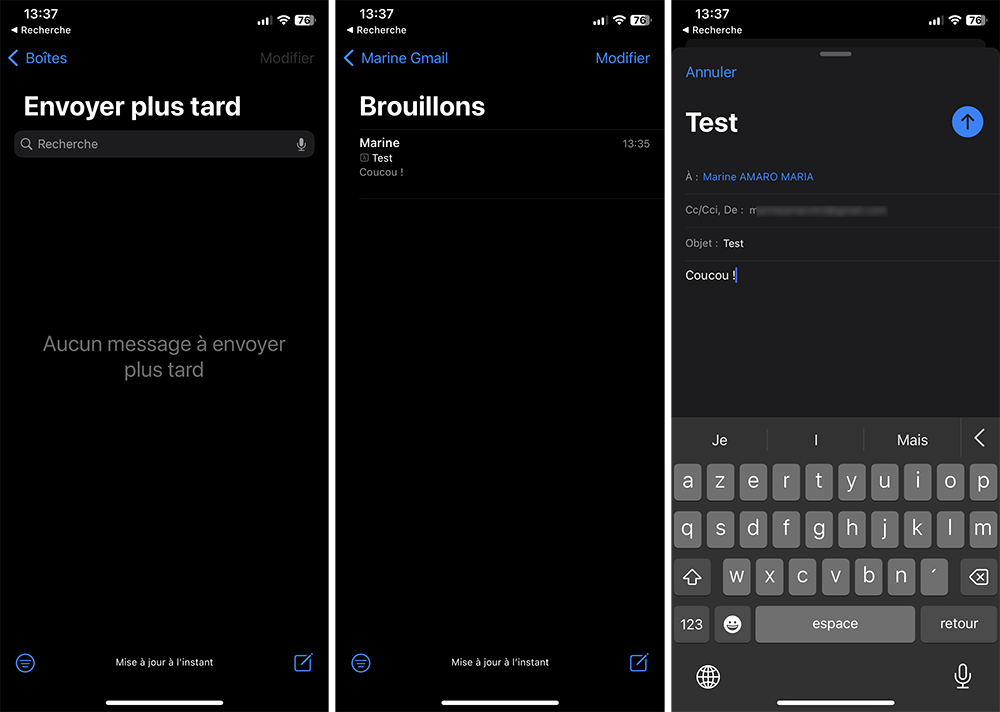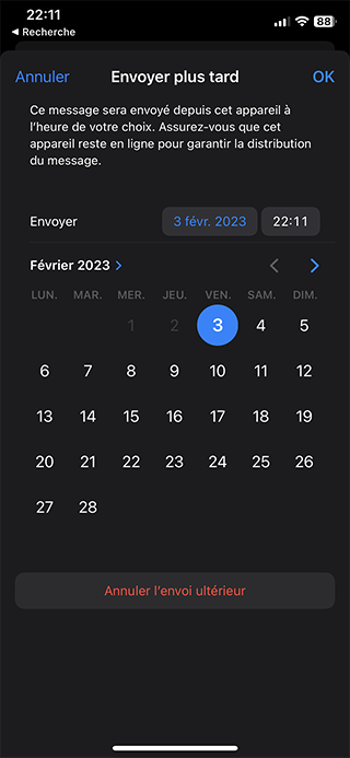 Attention ! L’iPhone (iPad ou Mac) qui a programmé l’envoi doit être allumé, connecté et l’app Mail ouverte (même en fond) pour que l’e-mail puisse s’envoyer. L’e-mail n’est pas stocké sur des serveurs, mais en local, sur l’appareil.