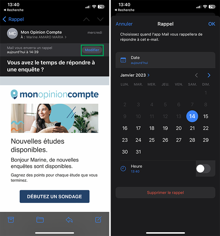 Si vous vous êtes trompé dans le jour ou l’heure de programmation, vous pouvez reprogrammer votre e-mail :