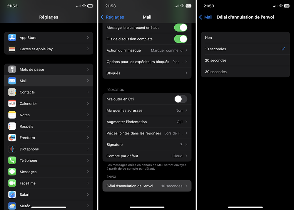 2.3.3. Allez à Réglages > Mail > Délai d’annulation de l’envoi ;