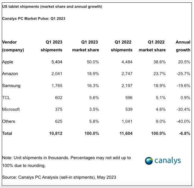 C’est en effet ce que nous déclare le cabinet Canalys. Les estimations d’expédition des iPad du cabinet indiquent une croissance de 20,5 % d’une année sur l’autre, ce qui représente près d’un million d’iPad supplémentaires vendus aux États-Unis. Ainsi, cette croissance a fait passer la part d’Apple sur le marché américain des tablettes de 38,6 % à 50 % (Q1 2022 contre Q1 2023). Et pour le cabinet, l’iPad d’entrée de gamme, le modèle de 10e génération, a joué un grand rôle dans cette montée ; en effet, Canalys déclare que ce sont ses ventes qui se sont décollées sur la période en question.