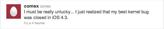 Pour terminer, Comex annonce que la plupart des bugs qu’il avait trouvés dans le kernel ont été comblé dans l’iOS 4.3 :