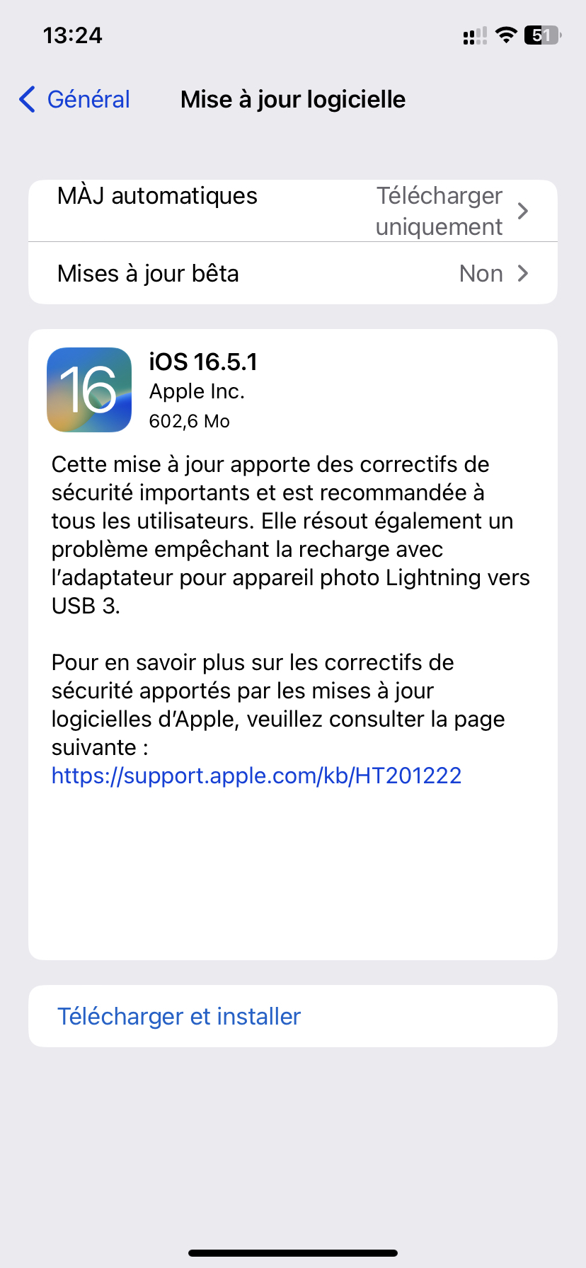 Pour télécharger et installer la version d’iOS 16.5.1 sur votre iPhone et celle d’iPadOS 16.5.1 sur votre iPad, rendez-vous dans Réglages > Général > Mise à jour logicielle.