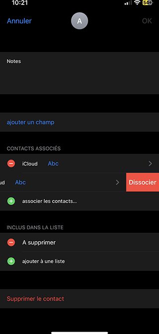 1.2.7. (Optionnel) Appuyez sur le – rouge, puis dissocier, pour ne plus associer ces contacts ;