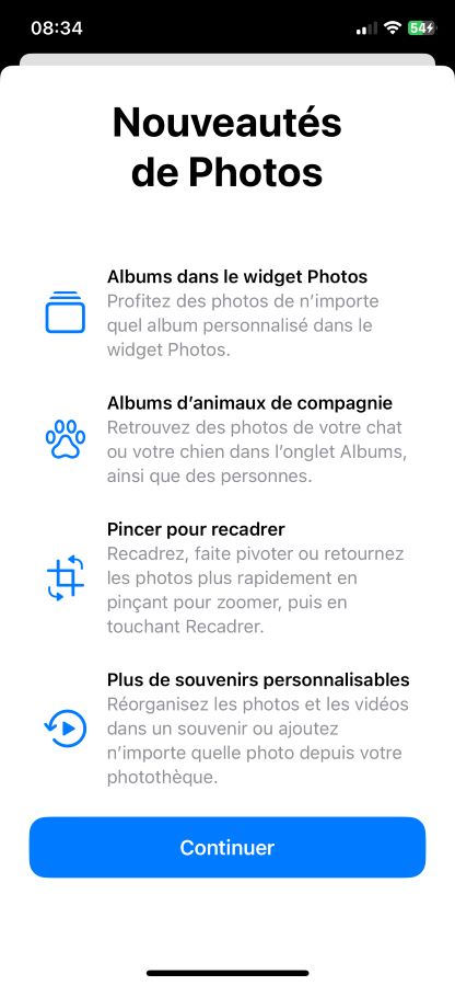 - Après la mise à jour vers la version d’iOS, un pop-up apparaît au premier lancement de l’application Photos afin de dévoiler les nouveautés.