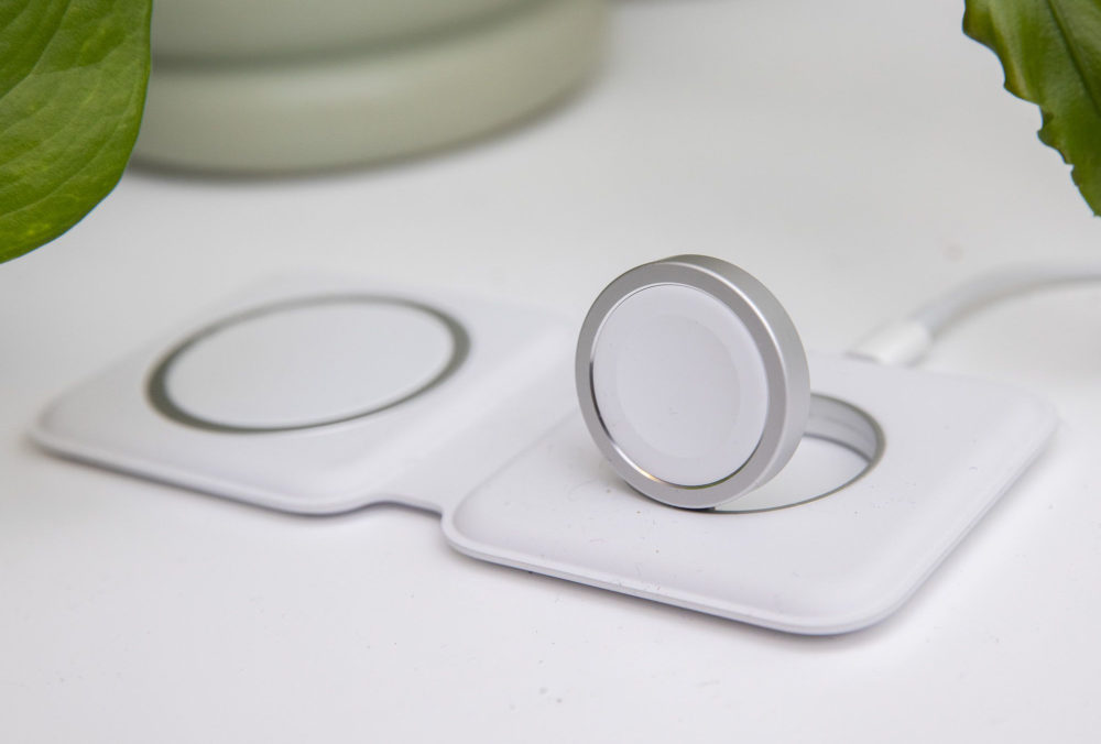 « Le chargeur double MagSafe vous permet de recharger facilement vos iPhone, Apple Watch, boîtier de charge sans fil pour AirPods ou autres appareils certifiés Qi. Placez vos appareils sur le chargeur. Ce simple contact suffit pour lancer une charge régulière et efficace. Ce chargeur se replie de façon compacte pour vous suivre dans tous vos déplacements. »
