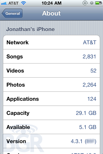 Voilà pourquoi -> Parenthèses bien trop petite comparé aux majuscules GB du dessus, très pixelisées à mon goût et enfin bien basse comparé à la ligne d’écriture du pseudo 4.3.1… et enfin depuis quand Apple utilise le code de l’iOS à 3 caractère ?? (( ce qui est flouté et qui sous 4.2.1 est 8C148)) :) voilà sur ce moi je passe à l’iOS 6.0 quand vous voulez…